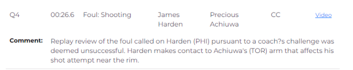 在76人和猛龙系列赛G3比赛中,哈登在末节还剩26.6秒时吃到第6次犯规,当时里弗斯挑战失败,裁判报告显示,哈登碰到了阿丘瓦的手臂,影响了后者的投篮,这次吹罚是正确的。