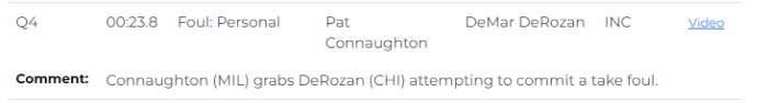 第四节23.8秒,公牛连续抢到进攻篮板,德罗赞从外线突破上篮,迎着字母哥打进高难度制胜一球,裁判报告显示,德罗赞得分前,康诺顿拉拽德罗赞应该吹罚防守犯规,这是一次漏判。
