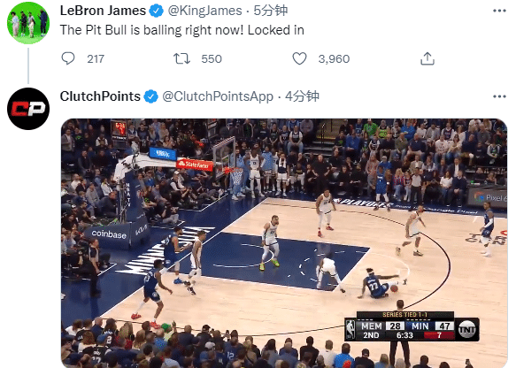 JRS直播04月22日讯 ,NBA季后赛森林狼再战灰熊,G3再次大战,森林狼悍将贝弗利打出血性和侵略性,多次单挑莫兰特并且做出嘲讽莫兰特太矮小的手势;急中生智砸板空接上篮一幕引热议,詹姆斯发推盛赞:斗牛犬正在大秀特秀!锁定!