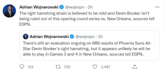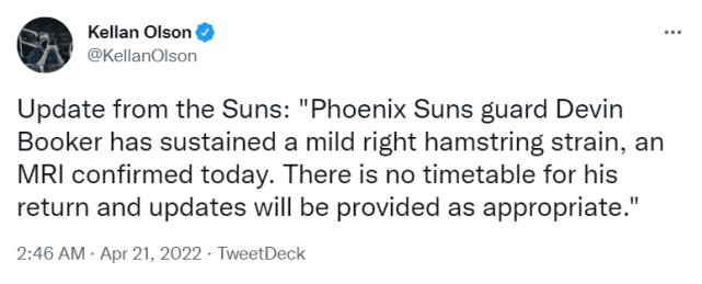 医学专家Evan Jeffries曾公布腿筋伤势的恢复时间表,如果只是腿筋紧张,那就是每日观察,如果是一级拉伤,预计要缺席7-10天,如果是二级拉伤,预计要缺席几周。现在来看,布克的情况有可能是一级,名记沃纳罗斯基透露他可能缺席G3和G4两场比赛,也符合这样的判断。