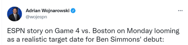 JRS直播04月21日讯 ,ESPN名记沃纳罗斯基报道,消息人士告知,篮网球星本-西蒙斯通过这周的训练以及对未来几天的进展预期,已经将北京时间下周二(4月26日)的系列赛G4定为本赛季处子秀的现实目标。