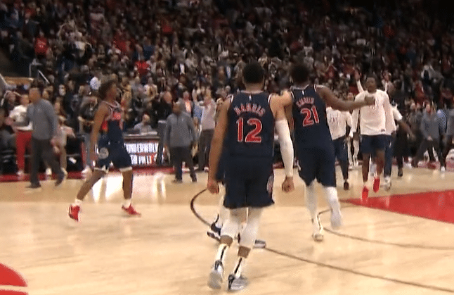 恩比德命中三分球之后,也兴奋地怒吼庆祝,并且跺脚狂跳不止!费城队友们此时也涌向恩比德,向他表示祝贺。替补席上,老里弗斯兴奋挥拳,助教卡塞尔也激情庆祝。而猛龙主场球迷则非常失落,发出巨大的哀叹声。