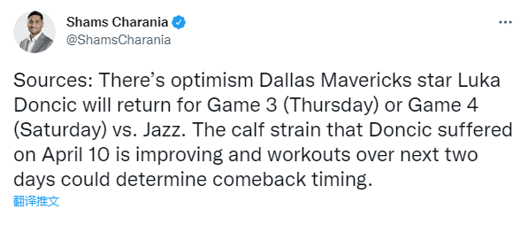 JRS直播04月20日讯 ,独行侠利好消息,据名记Shams报道,东契奇有可能在系列赛G3或者G4中回归,他的小腿伤势正在好转,接下来两天的训练将决定他复出的时间;换句话说,东契奇可能在做客盐湖城时重返赛场。