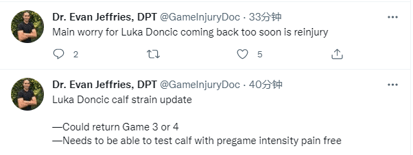 对于东契奇的复出情况,医学专家Evan Jeffrres发推写道:东契奇可能G3或者G4复出,需要在赛前测试小腿时无痛才能复出,最大担忧是东契奇提前复出可能会再次受伤。
