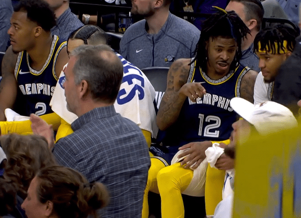 JRS直播04月20日讯 ,NBA季后赛灰熊主场再战森林狼,第三节场上发生意外伤病事件,莫兰特的大腿被撞,单膝跪地捂着大腿十分痛苦,坐回替补席,之后返回更衣室,所幸伤势无碍,之后回到场边并热敷治疗。