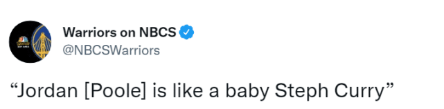 克莱也聊到了普尔,生涯前两场季后赛,普尔得到59分,队史第二多,仅次于张伯伦(63分)。克莱说道:“乔丹(普尔)就像一个娃娃版的库里,拿球在手,能在外线接球就射!他攻击篮下也很厉害。”