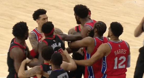 JRS直播04月19日讯 ,NBA季后赛76人再战猛龙,比赛一开始场上就发生小冲突,恩比德和阿奴诺比相互推搡,哈登等球员劝架,最终两人都吃到技术犯规,冲突后恩比德杀红眼,单节19分太疯狂。