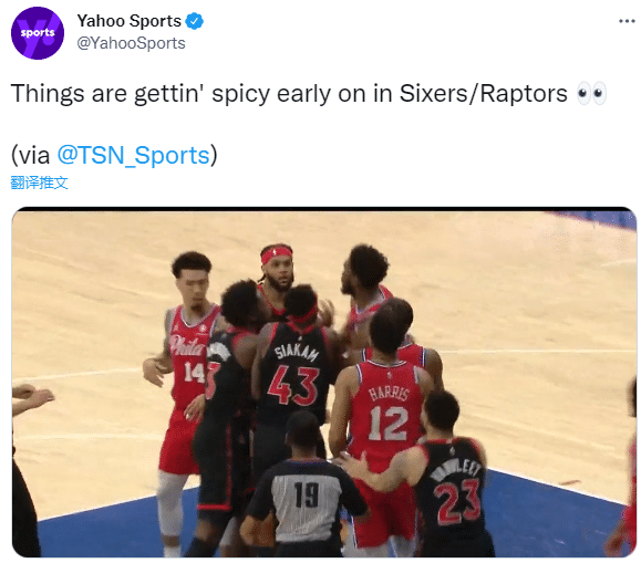 76人和猛龙系列赛G2火药味十足,开场仅打88秒就爆发冲突;之后西亚卡姆凶狠放倒恩比德,裁判回放之后并没有升级为恶意犯规。