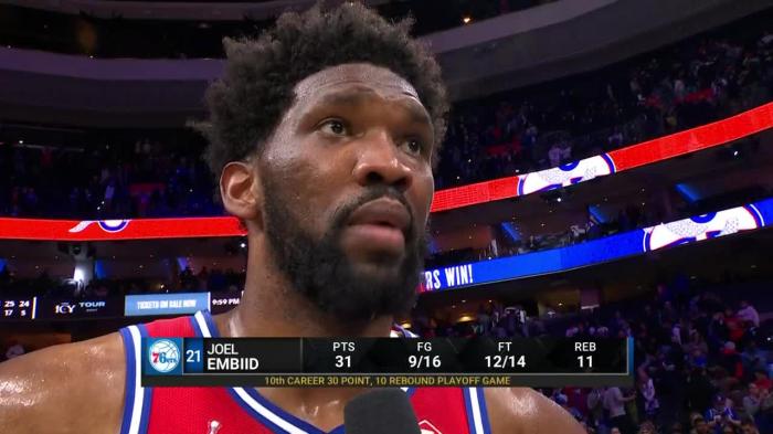 JRS直播04月19日讯 ,NBA季后赛76人112-97再次大胜猛龙,系列赛大比分2-0领先,哈登全场上场41分钟拿到14分5篮板6助攻3抢断2盖帽,恩比德则是16投9中、罚球14中12轰下31分11篮板,马克西23分9篮板8助攻,首发五人全都得分上双。