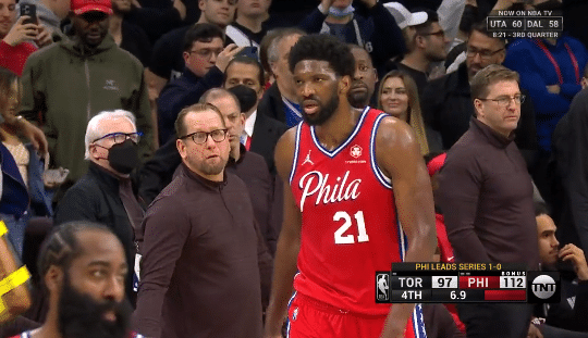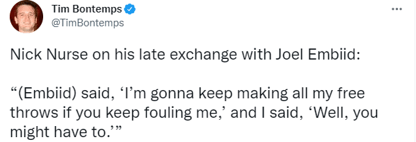 恩比德和纳斯的对话内容曝光,据名记Tim Bontemps报道,恩比德对纳斯说:‘如果你继续对我犯规,我会继续罚球;纳斯表示:好吧,你可能不得不这么做。