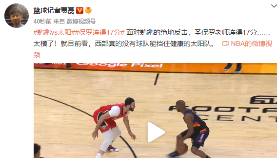 贾磊:面对鹈鹕的绝地反击,圣保罗老师连得17分…… 太横了!就目前看,西部真的没有球队能挡住健康的太阳队。