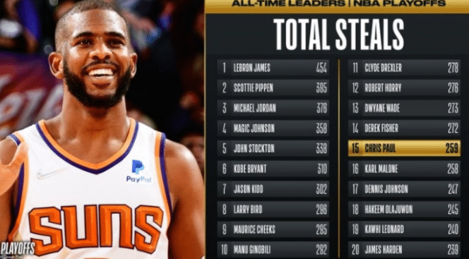 保罗不仅仅在末节轰下19分,保罗季后赛生涯抢断总数来到259个,超越卡尔-马龙(258)升至历史第15位,迎来里程碑时刻。