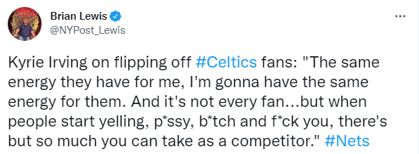 今日中场休息时,凯尔特人球迷怒骂欧文垃圾,欧文本人爆粗回应Fxxk you!赛后欧文回应激怒绿军球迷,表示:我将一些球迷给予我的能量回馈给了球迷,并不是每个球迷都喜欢,我听到了一些恶俗的词汇,比如p*ssy、 b*tch和f**k等,但我不认为这里存在任何真正的敌意。