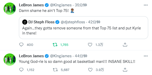 老詹还为欧文落选75大鸣不平,发推写道:该死!欧文没进NBA历史75大球星真是个耻辱!
