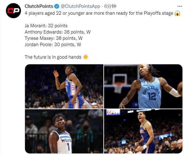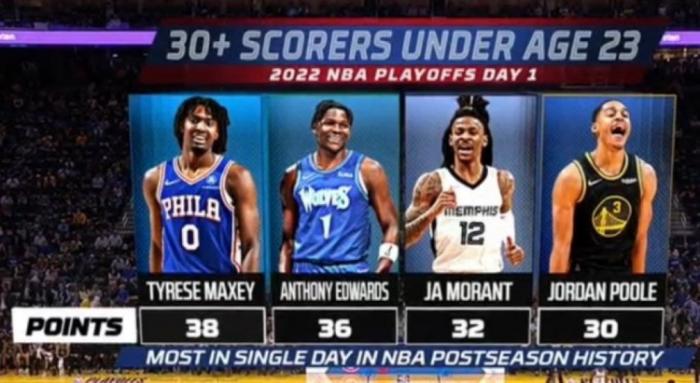 季后赛第一人共有4位23岁以下的球员轰下30+,他们分别是马克西38分、爱德华兹36分、莫兰特32分、普尔30分,创下了NBA季后赛历史上单日年龄23岁以下球员得分30+最多纪录。