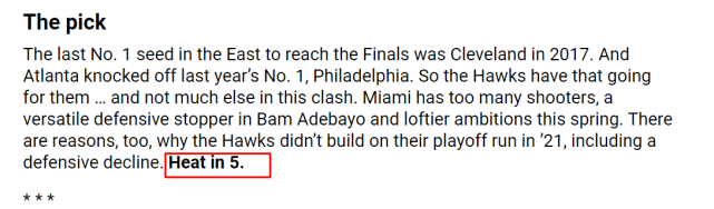 上赛季,老鹰淘汰了当时的一号种子费城76人,挺进东决。不过,热火有太多的射手,而且阿德巴约是一道防守大闸,老鹰很难闯过热火这一关。官网预测热火将以4-1的总比分晋级。
