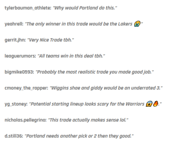 球迷yeahrell写道:“这笔交易唯一的赢家是湖人!”球迷yg_stoney写道:“勇士潜在的首发阵容看起来很可怕。”球迷nicholas.pellegrino写道:“这笔交易实际上很有意义,哈哈。”球迷d.still36写道:“开拓者再得到1-2个选秀签,就算完美了。”