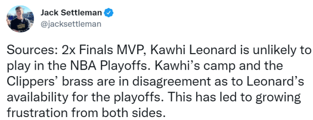 快船又将面临人手不足的状态,而且最新报道称, 莱昂纳德阵营与快船方面在小卡是否能在季后赛复出的问题上存在一些分歧。这种分歧导致双方都对彼此越来越不满。