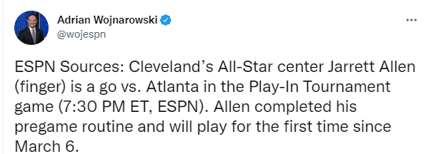 在骑士和老鹰的生死战中,艾伦带伤复出,骨折的手指仍旧绑着绷带,因伤连续缺席19场比赛;本赛季艾伦场均拿到16.1分10.7篮板1.4盖帽,带伤复出助骑士冲击季后赛,和加兰德、勒维尔、马尔卡宁、莫布里一起首发;另外赛季报销的塞克斯顿已经开始进行投篮训练。