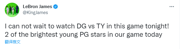 詹姆斯发推写道:我已经等不及要看加兰与特雷杨的对决了,他们两人是今天比赛中最闪耀的两位年轻控卫。