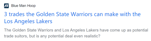 JRS直播04月15日讯 ,美媒Blue Man Hoop晒出了湖人和勇士之间交易的三大方案,认为两队可以各取所需。詹姆斯和库里不能并肩作战,或许有机会互换搭档。