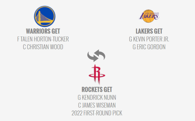勇士得到伍德和霍顿-塔克,湖人得到小凯文-波特和戈登,火箭得到纳恩、怀斯曼和2022年首轮签(来自勇士)。