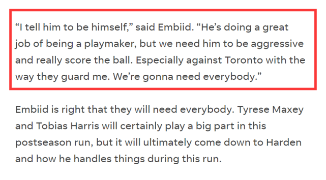 恩比德表示:“我告诉他让他做自己,哈登在组织方面做得很好,但我们需要他打出侵略性并努力得分,尤其是在我面对猛龙那种防守方式的时候,我们需要队内的每个人挺身而出。