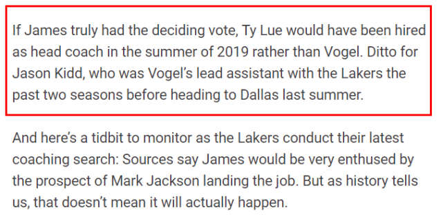 “如果詹姆斯真的拥有决定性的一票,那么泰伦-卢会在2019年夏天被聘为湖人的主教练,而不是沃格尔,”阿米克在文中写道。事实也的确如此,詹姆斯在湖人决策方面有一定的影响力,比如他推动了威少的交易,但并非每一件事都能让他如愿以偿。至少在选帅方面,他并没有决定性的一票。