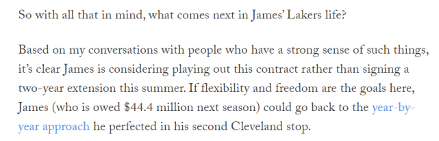 那么詹姆斯会和湖人提前续约吗?阿米克与不少熟悉这一情况的人士有过交流,他指出詹姆斯更想履行完现有的合同,而不是在今年夏天提前续约两年。如果詹姆斯把合同灵活性和自由视为目标,他应该会回到第二次效力骑士时的策略:逐年签约。