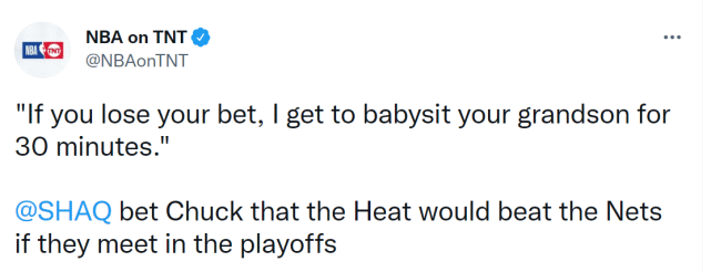 奥尼尔回应道:“如果你打赌输了,我会来照看你的孙子30分钟。”