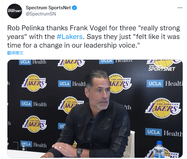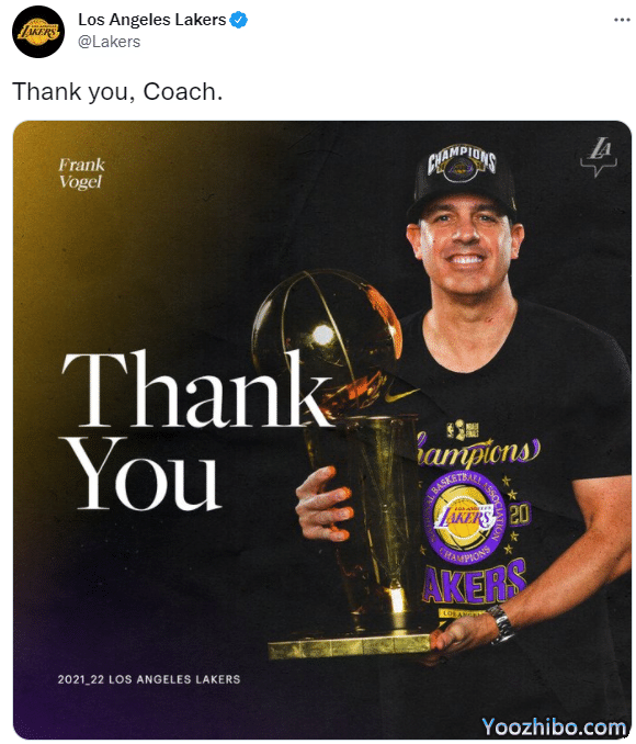 JRS直播04月12日讯 ,2021-22赛季常规赛结束的第一天,洛杉矶湖人正式宣布解雇主教练沃格尔,官推晒沃格尔捧杯照,并且配文写道:谢谢你,教练。
