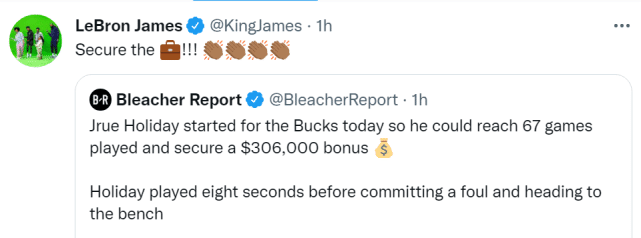 JRS直播04月11日讯 ,雄鹿后卫霍乐迪今日首发,但他只打了8秒钟就故意犯规,被教练换下。这次象征性的出场,可以让霍乐迪的出战场数达到67场,确保他获得30.6万美元的奖金。詹姆斯转发这一新闻,看热闹拍手叫好:“钱已到手!”