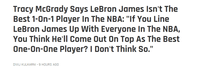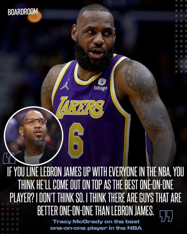 麦迪在节目上说道:“如果你把勒布朗-詹姆斯和NBA的其他人放在一起,你认为他在一对一单挑方面是最好的球员吗?我不这么认为。我认为比起詹姆斯,有些人的单挑能力更强。”