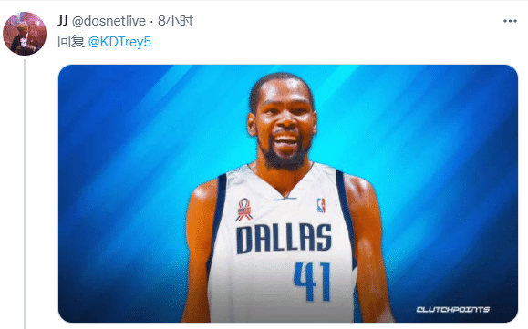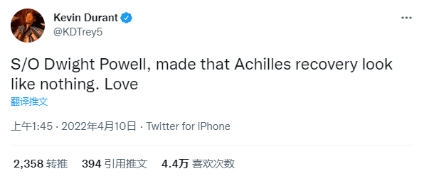 JRS直播04月10日讯 ,篮网球星杜兰特表达对独行侠首发中锋德怀特-鲍威尔表达敬意,发推写道:为德怀特-鲍威尔喝彩,从跟腱撕裂中康复的他看起来完全没变,爱。杜兰特如此动态引热议,2000多人转推并获得4.4万次点赞,有球迷晒神图调侃杜兰特加盟独行侠。