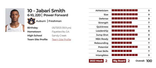 先来看看状元头号热门贾巴里-史密斯。他身高2米08,体重99公斤,选秀模板是克里斯-波什和拉沙德-刘易斯。知名选秀网站NBADRAFT给他打出的能力总评分是100分,运动能力、体型、防守、速度、跳投、潜力和无形资产都打了9分的高分,相对较低的是力量、篮板和内线技巧,各打了7分。