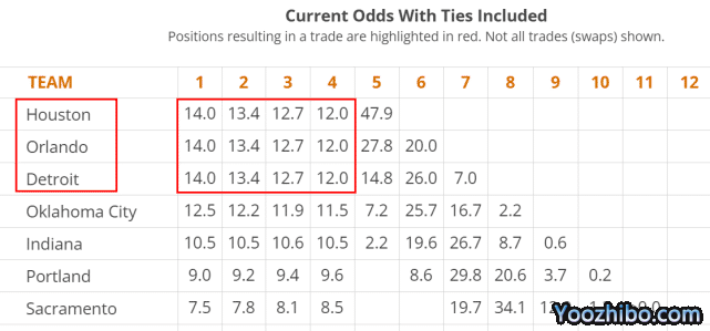 JRS直播04月09日讯 ,根据目前的球队战绩排名,火箭、魔术和活塞是本赛季成绩最差的三支球队,在抽签概率方面,他们同样拥有14%的状元签概率、13.4%的榜眼签概率,12.7%的探花签概率,抽到4号签的概率也同为12%。上赛季得到状元签的是活塞,今年的状元签又将花落谁家?北京时间5月18日,NBA抽签仪式将在芝加哥进行,答案将在那时候揭晓。