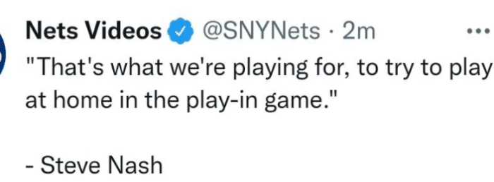 赛后篮网主帅纳什接受采访,他表示:“我们就是要为第7名而战,我们想在主场打附加赛,要准备好拿下下一场。”