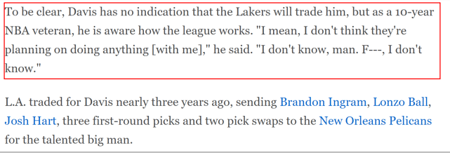 浓眉接受ESPN专访时谈到关于他的交易流言。戴维斯说:“我无法控制那些事情。那是管理层的事,是我的经纪公司Klutch和里奇-保罗的事情。我的工作是上场打球。我当然喜欢在洛杉矶打球。如果那(交易)是他们正在考虑的事情,那么我们会就此进行一番谈话。我不知道他们在谈论什么,不知道计划是什么。”