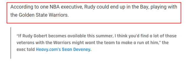JRS直播04月08日讯 ,据NBA记者Sean Deveney报道,一位NBA高管爆料称勇士有兴趣追求戈贝尔。维金斯和怀斯曼成为潜在的报价筹码,此前有报道称,独行侠也对戈贝尔很有兴趣。