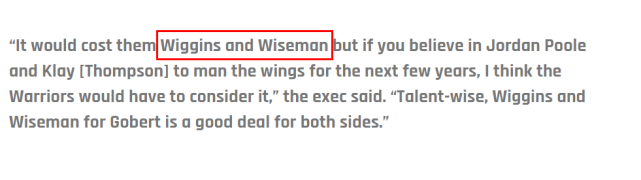“这会让他们付出维金斯和怀斯曼的代价,”高管表示,“但如果勇士相信普尔和克莱-汤普森能搞定侧翼,他们的确可以考虑这样的报价。从天赋上来说,戈贝尔与维金斯+怀斯曼进行互换,对双方来说都是一笔不错的交易。”