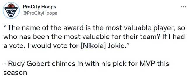 与其说是被打服了,不如说是惺惺相惜。最佳防守球员看到了约基奇作为MVP给球队带来的价值。除了力挺约基奇拿MVP,戈贝尔还谈到本赛季最佳防守球员的争夺,戈贝尔表示:“如果有任何一个不叫鲁迪-戈贝尔的球员完成了我本赛季所做的事情,拥有了像我本赛季所拥有的影响力,他们将是(DPOY)的领跑者,这很明显。为什么我要因年复一年的坚持而受到不公正的对待?”目前,这一奖项的领跑者是斯马特,戈贝尔可能无缘第四次拿到这个奖项了。