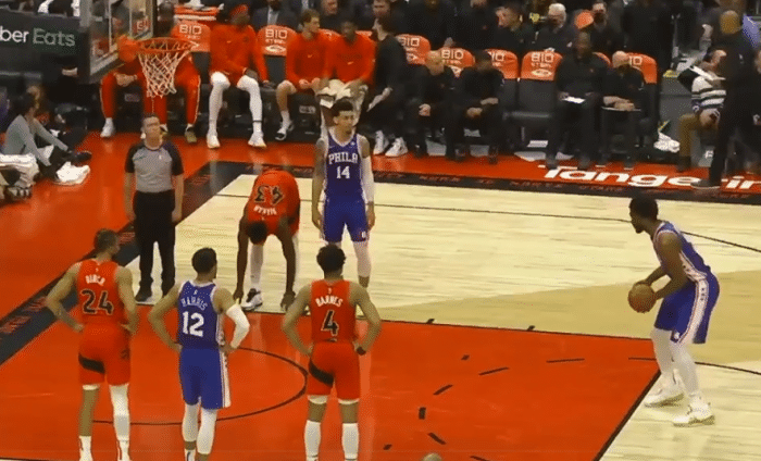 第二节的比赛开始后,76人进攻端突然陷入停滞,猛龙一波9:1的小高潮反超比分,保罗-里德补扣得分,阿丘瓦造犯规上罚球线,两队进入拉锯战,比分交替领先,塞迪斯-杨不满裁判吹罚领到技术犯规,比赛末段米尔顿三分命中,恩比德连续得分,全半场打完,76人60-56领先猛龙。半场打完恩比德14分6篮板2助攻,哈登8分2篮板8助攻。
