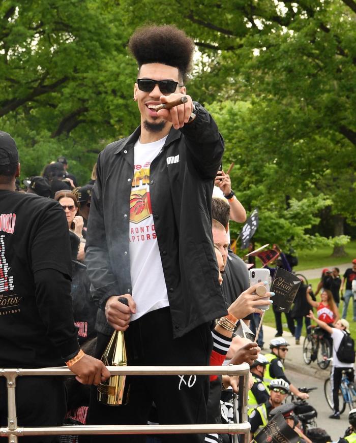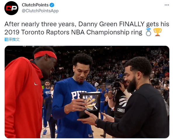 今天,34岁丹尼-格林身穿一件带着亮片的鲜艳外套,走进球馆时,满脸喜悦之情,并且和一些熟人打招呼;今天是属于格林的荣耀时刻,正式在猛龙主场领取2019年的总冠军戒指,范弗利特为格林颁发戒指,西亚卡姆也在一旁,现场的球迷集体为他鼓掌欢呼,恭喜队史首冠功臣领取戒指。