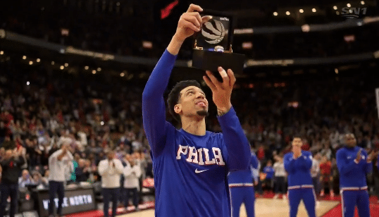 格林挥手向球迷致谢,并且举着戒指向全场球迷展示,76人众人也为他鼓掌庆祝。