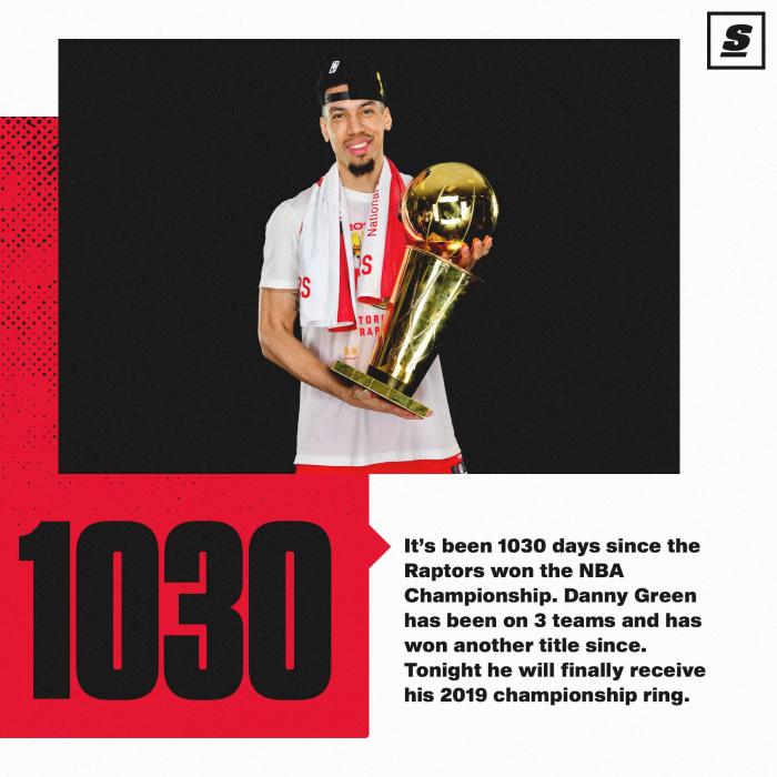 时隔1030天,猛龙旧将丹尼-格林终于当着猛龙球迷的面领取属于自己的总冠军戒指;由于新冠疫情和伤病的原因,这一刻,格林足足等了将近3年。