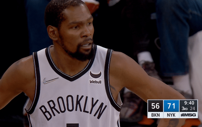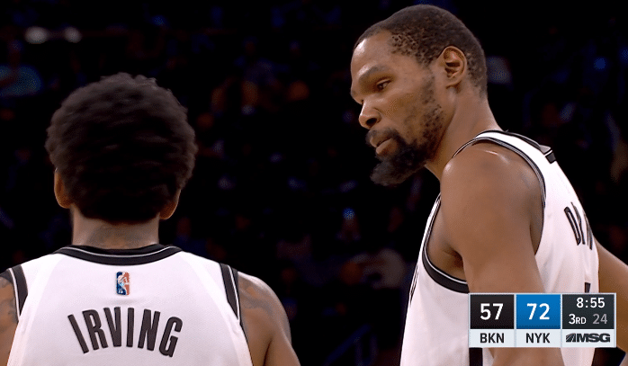 今日纽约德比,现场DJ介绍篮网双巨入场时,杜兰特和欧文被嘘,篮网第一节和尼克斯打得十分胶着,但篮网在首节末端断电,被打出10-0攻势,第二节开场又被打9-0,因此篮网被尼克斯打出19-0超级攻势,瞬间落后到两位数,欧文三分止血。