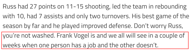 至于威斯布鲁克,同样得到lakeshowlife的肯定。对掘金一战,威少贡献27分10篮板7助攻,只有2次失误。他的防守也有所进步。“下一支懂得使用拉斯(威少)的球队和教练,看到了他有能力做到什么,”lakeshowlife写道:“别担心,拉斯,你并没有过气。能力不行的是沃格尔,我们将在几周后看到一个人依然有工作,但另一个却丢掉饭碗。”