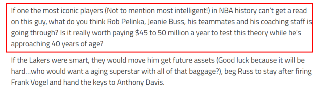 lakeshowlife写道:“如果联盟里的标志性人物(指贾巴尔)都读不懂这个人,你认为佩林卡、珍妮-巴斯、他的队友和教练组就可以吗?他已经快要40岁了,用每年4500万-5000万美元去验证这个理论真的值得吗?”