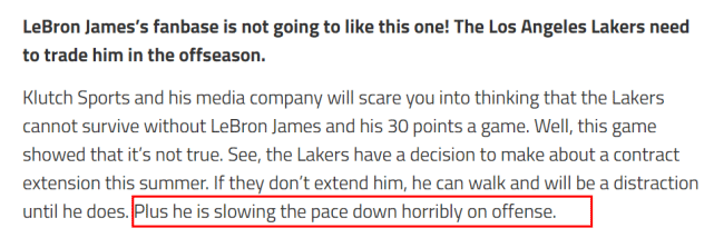 最后,lakeshowlife建议湖人应该交易詹姆斯。“Klutch体育(詹姆斯的经纪公司)和他的媒体公司会吓唬你,让你认为没有詹姆斯的场均30分,湖人就活不下去,”lakeshowlife写道,“可是事实并非如此,今年休赛期湖人要决定是否续约詹姆斯。如果他们不续约,詹姆斯可以选择离开,而在他真正离开前,都会成为球队的干扰因素。另外,他在进攻端真的会严重拖慢球队的节奏。”