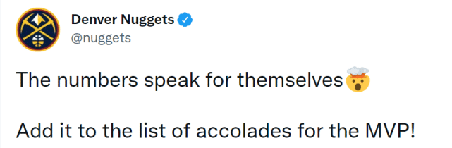 赛季至今,约基奇出战72场,场均26.8分13.7篮板8助攻,有望蝉联常规赛MVP。